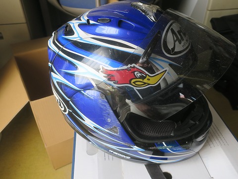 11:40 引退 青いヘルメットは引退です。 と言うよりも、このヘルメットは2015年の6月にサーキットで転倒したときに被っていたもの。 で、転倒傷あり。 衝撃をどれくらい受けてるかわかりませんので、本当は使っちゃダメなやつですよね。(汗) 結局、転倒から8年も使っちゃった。(-_-;) |