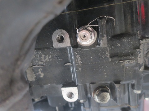 11:19 オイルを抜く 軽く暖気をしてから、オイル抜きます。 まずはエンジン下部にあるドレンボルトを緩めます。 ドレンボルトにワイヤーロック。 見えないところでこだわり。(笑) |