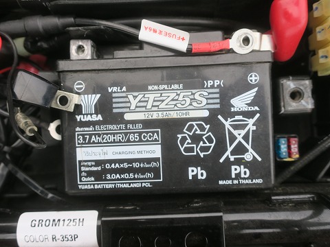 15:22 前のバッテリーも バッテリーにアプローチしました。 このバッテリーもよく見ると、右下に made in Thailand の文字が。 確かに、GROM自体、タイホンダで製造してますからね。 |