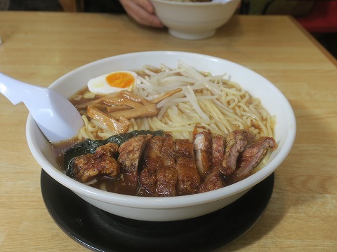 13:06 パーコー麺を 注文は、排骨麺(パーコー麺)。 言わずもがな、大盛でございます。(笑) それでは、「いただきます。」 排骨は、ブランド豚の上州麦豚を使用しているそうです。 少し強めに揚げられた排骨は、パリパリ感があって美味しいです。 排骨っと言っても、骨は付いてません。 |