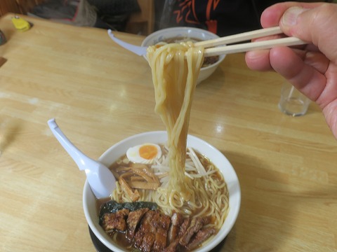 13:06 箸上げ 麺は中太のストレート麺。 腰は緩めで、中華麺とうどんの中間くらいかな。 柔らかい麺の腰は好みが分かれるところですが、たまにはこんな食感もよろしいかと。 |