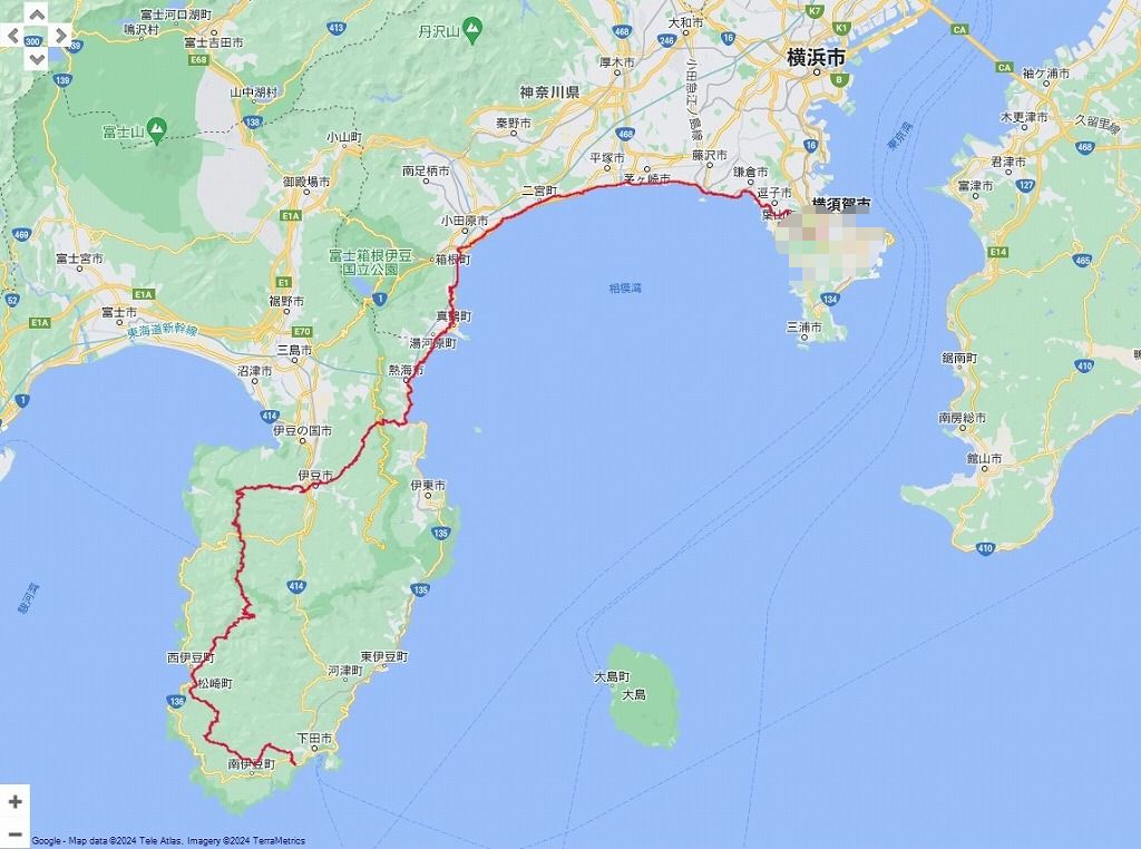 | 2日目の道程:弓ヶ浜〜蛇石峠〜松崎〜西伊豆高原〜西伊豆スカイライン〜修善寺〜熱海〜横須賀(自宅): 191.49km | |