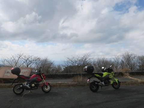 12:01 山を登って と言うことで、先ほどの仁科のセブンイレブンから脇道の県道59号伊東西伊豆線に入り、山を登って仁科峠(にしな とうげ)までやってきました。 寒い。 たぶん気温は一桁真ん中くらいかな。 駿河湾からの吹いてくる風が冷たいですね。 それでも、最近はウェアーが良くなったので、以前ほどじゃありませんし、何より今シーズン取り付けたグリップヒーターが真価を発揮しています。(笑) 仁科峠から先は、県道411号西天城高原線〜県道127号船原西浦高原線で、バイクで走るのに楽しいワインディング区間になります。 ただ、ここまでの県道59号線はほぼ全線センターラインの無い1.5車線の狭隘な路線で、路面に落ち葉があったりして、少々窮屈なルートです。 それでもGROMで走る分には、十分に楽しむことができます。 |
