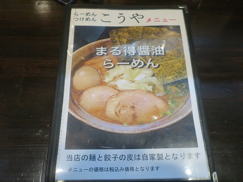 11:33 注文は 「危ねぇ~。」 店内に入ると、ほぼ満席でしたよ。 1組テーブル席希望で待ちのお客さんがいましたが、最後の最後に1つだけカウンター席が空いていたので、そこに座れました。 もう既に食べているお客さんもいましたので、(週末などは)営業時間より早くお店を開けているのかもしれませんね。 さて、注文。 お品書きを見ると、表紙に”まる徳醤油らーめん”。 当然お奨めなんでしょう。 これにします。 らーめんは他にもみそ味、魚介系などがあり、看板にもあるように”つけめん”もありましたよ。 |