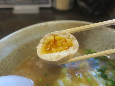 11:51 これも これも海苔に隠れていましたが、お品書きの写真には写っていたので・・・。 タマゴは、中心部に半熟が少し残るくらいのゆで加減。 個人的には、ラーメンのトッピングのタマゴは半熟よりも固茹で気味が好みなので、これくらいがよろしいですね。 麺が普通盛りで160gって書いてあったので、少ないかなぁ。って思いましたが、トッピング充実していたので、これで十分でした。 大盛にすると、麺が1.5倍の240gになるので、ちょっと食べ過ぎになっちゃうかな。(笑) |