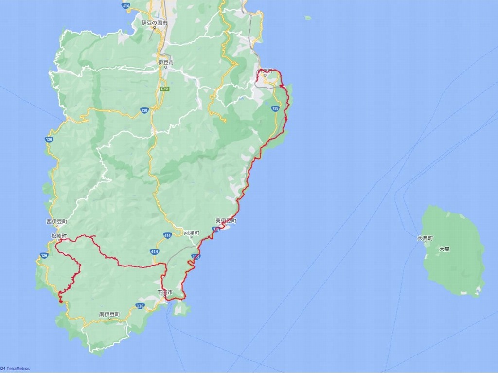| 午後の道程:南伊東〜川奈〜城ヶ崎〜伊豆白浜〜下田〜婆娑羅峠〜松崎町〜蛇石峠〜南伊豆町子浦 :108.91km | |