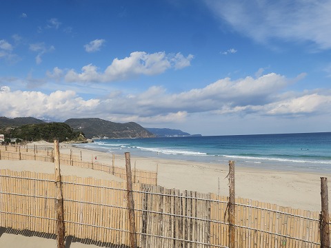 13:44 白浜は コーヒーを片手に、国道を渡って白浜を眺めに。 きれいな砂浜が広がっています。 夏になると、海水浴のお客さんで一杯になりますが、今はその気配はありません。 先に進みます。 |