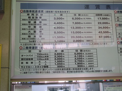 8:27 千葉に渡る料金は 窓口に行って、あらためて料金を確認(紹介)。 125cc未満の原付だったら、往復で3,550円。 この金額には運転者1名が含まれているので、片道1,775円で千葉に渡れるわけです。 自分が持っている1000ccのGSX-Rだと、往復で5,000円、片道で2,800円。 調べてみたら、自宅から首都高速の幸浦ICまで下道走って、アクアラインで東京湾を渡って袖ヶ浦ICまで行った場合、ETCの割引を使うと片道 1,660円で行けるみたい。思いのほか安かった。 (^_^;) GSX-Rだったら、この選択肢もありだな。 でもGROM じゃ、高速走れないので、フェリー一択。(笑) |