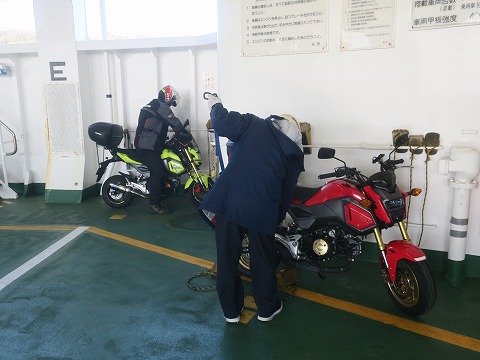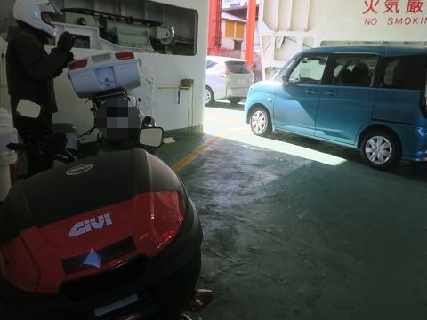 8:58 乗船 下船が終わり次第乗船開始です。 乗船はまずはバイクから。 壁際の端っこに駐めるからね。 バイクを駐めたら、上の階の客室に向かいます。 |
