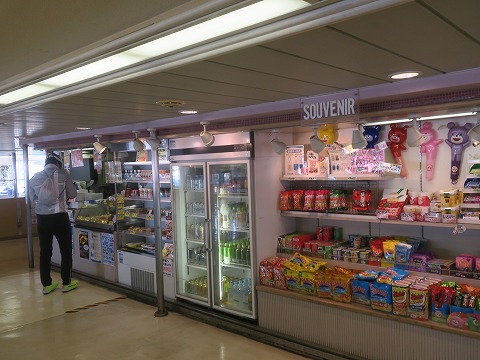 9:00 船内には売店 客室に上がってきました。 飲物、軽食、お菓子とかお土産とかちょっとしたものを売っている売店がありました。 そう言えば、前回東京湾フェリーに乗ったのいつだったかな。 多分2回くらい乗った記憶はあるんですが、30年位前かな? 定かじゃありません。 もちろん、船内に売店があったか・なかったかなんて覚えてません。(笑) |