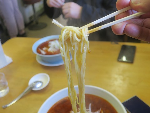 12:45 いただきます。 それでは、「いただきます。」 「ごほっ!ごほっ!」 むせる。 むせるよ。 麺をすするとラー油の辛味成分でむせます。(笑) 辛さは、ココイチの3~4辛ぐらいでしょうか。 まあまあ辛い。 (ココイチの辛さで表現すれば、全国でわかりやすいでしょ) 麺は中細ぐらい。 縮れは少なめです。 麺のコシは中庸かな。 スープの辛味が勝って、自分にはわかりません。 咳をしいしい食べていると、唐辛子のカプサイシンのせいで頭から汗が噴き出ます。 テーブルに置いてあるティッシュは必須ですね。 |
