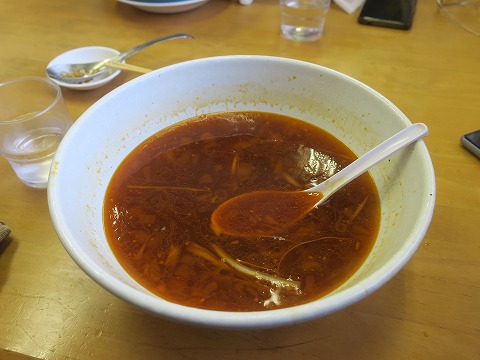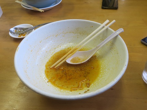13:00 ご馳走様です。 スープもいただいて、完食です。 「ご馳走さまでした。」 「美味しかったです。」 <(_ _)> 勝浦タンタンメンですが、ラー油の辛味一杯で体は暖まりますが、唐辛子効果で汗かいちゃってね。 風通しのいい服着てバイク乗ったら、逆に体が冷えちゃいそうですよ。 |
