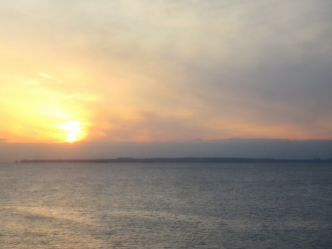 17:23 出港 フェリーは定刻の17時20分に金谷港を出港。 浦賀水道を渡ります。 日が沈みかけていますが、雲が多いので、きれいな日没は見られそうもないですね。 |