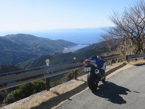 14:09 戸田湾まで 戸田峠から県道18号線はしばらくは県道127号線との重複区間になります。 この区間は、タイトなカーブが連続し、プラス下り急勾配なので、おっとっとできないカーブが連続してえ気が抜けません。 途中でちょっとバイクを駐めて、写真を撮るなり。 眼下に見えている湾は戸田湾です。 ここから戸田湾まで一気に下って行く形になります。 |