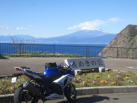 14:29 煌めきの丘は 県道17号線の途中にある”煌めきの丘”。 偶には寄ってみる。 ちなみに読み方は、”きらめきのおか”です。 ミラーの陰になっちゃいました。 ここでも、とりあえず富士山の写真を撮っておく。 雲を被っているけど。 右手に写っている斜面は、実際は海から100mくらいの高さがあって、実物を見ると迫力があります。 |