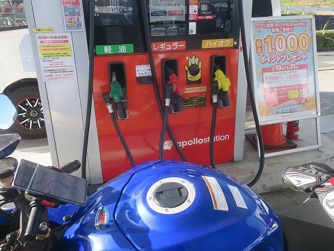 15:25 給油 三津のセブンイレブンで休憩したあと、引き続き県道17号沼津土肥線をで口野放水路の交差点まで東進。 その後、裏道を使ったりして、道の駅伊豆ゲートウェイ函南の隣り、国道136号線沿いにある apollostastion まで戻ってきました。 ここで今日1回目のガソリンを給油します。 燃料ランプが点灯してから約35km、まあガス欠はしない安全圏内で到着です。 地元よりガソリン高いので、刻んで10リットルだけ給油します。 (笑) |