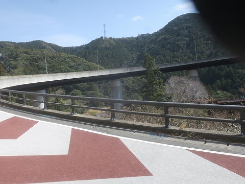 11:50 房総丘陵を ループ橋を上ります。 海岸線から数キロ入ったところで急激に立ち上がる房総丘陵の特徴が感じられますね。 ちなみに、この清澄山道ループ橋は房総半島唯一のループ橋らしいです。 ※ 右上の黒いのはデジカメのストラップだ。(笑) |