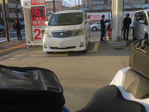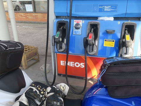 14:52 ガソリンを給油 湊の交差点で、近くのガソリンスタンドを検索。 フェリー埠頭とは逆方向、国道127号線を北上してガソリンスタンドまでやってきました。 ENEOSだけどね。 ガソリンお高いな。 観光地価格かな? ここから自宅まで10リットルもあれば帰れるので、刻んで「10リットル」だけお願いしました。 トイレを借りて、バイクに戻ると「これくらいでいいですかぁ。」 って、やられたぁ〜。 満タン入れられちゃいました。 (-_-;) ちゃんと伝えないとダメだね。(笑) |