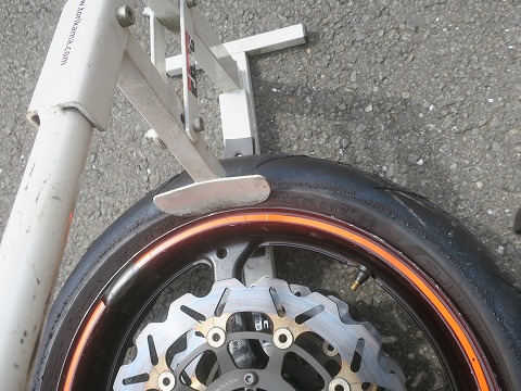 10:15 ビートを落とす エアーを抜いたら、ビートブレーカでビートを落とします。 3月にGSX-Rのタイヤを交換したけど、GSX-Rに履いていたROSSOUより楽にビートが落ちましたね。 やっぱりレーシングタイヤの方がケースは柔らかいみたいです。 |