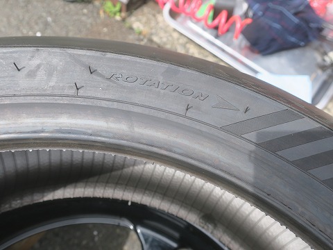 10:22 回転方向を 新しいタイヤを取付けます。 取り付ける前に、回転方向(ローテーション)を確認。 ホイールに付いている矢印(青く塗ってある)とタイヤのローテーションマークが揃っているか、要確認。 回転方向間違えると、悲しいですからねぇ。(笑) |