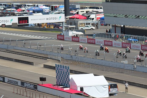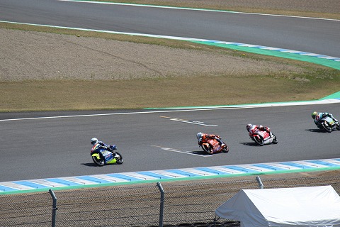 10:11 J-GP3クラスのスタート進行中 展示ブースをちょろっと見て、グランドスタンドにやってきました。 グランドスタンドの良い席は指定席。 端っこの方とかは、自由席。(笑) 自分は指定のない入場券できているので、端っこから観戦。 コース上ではJ-GP3クラスのスタート進行が行われています。 J-GP3は単気筒250ccのオートバイで争われるレースです。 |