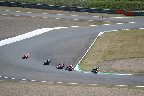 10:44 トップ争い レース進行中。 写真は先頭グループ。 J-GP3のレースは18周で争われています。 写真はセカンド アンダーブリッジ後、ヴィクトリーコーナー手前。 先頭グループ、5台によるトップ争い。 モビリティリゾート もてぎは、以前はツインリンクもてぎの名称でした。 ご存じだと思いますが、今バイクが走っている本コースと、インディとかNASCARのレースが行われていたオーバルコースの2つのコースがあったのでツインリンクだったと記憶しています。。 |