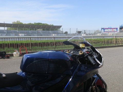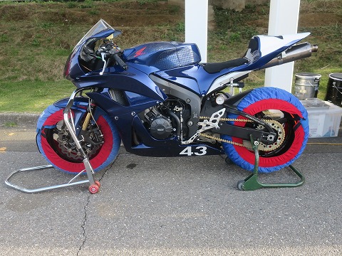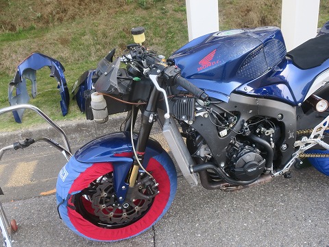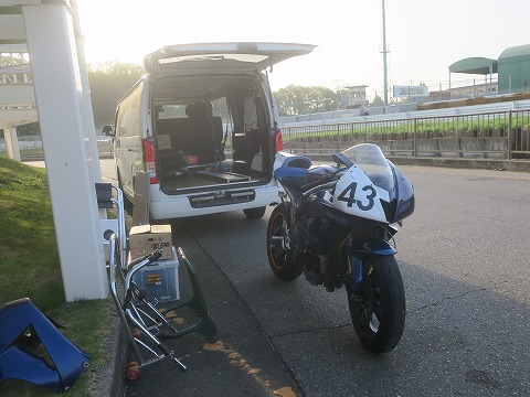 6:49 カウルを付けて カウルを取付けて、準備できました。 今日、一発目の走行は9時40分からなので、タイヤウォーマーはまだいいかな。 気温も寒く無いし、2時間暖めれば十分でしょう。 |