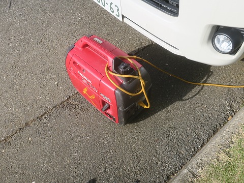 7:38 発電機に移す 暖気が終わったら、古いガソリンは抜いて、発電機に移しちゃいます。 発電機に入れるのは、想定内なので、あらかじめ1.5リットルくらいの余裕を作ってあります。 ここで発電機をスタートさせて、タイヤを暖め始めます。 走行まで2時間くらいあるので、ちょうどいい時間ですね。 |