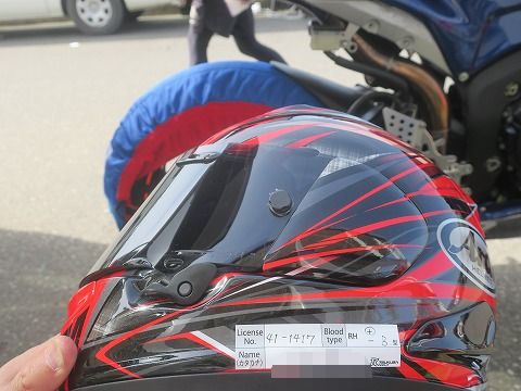 8:46 おニューのヘルメット そして、のおニューのヘルメット。 今年の正月に買ったんですが、今日がデビューです。 今まで被っていたヘルメットより落ち着いた感じです。 サーキットだと、ちょっと地味かな。 筑波サーキットでは、ヘルメットに名前や血液型を書いたステッカーを貼らなければいけません。 |