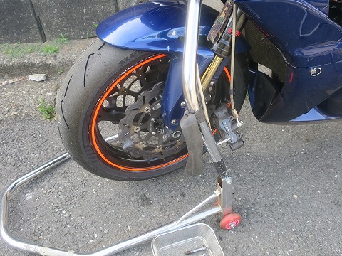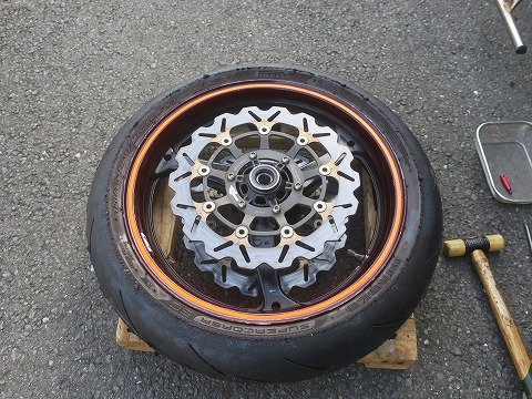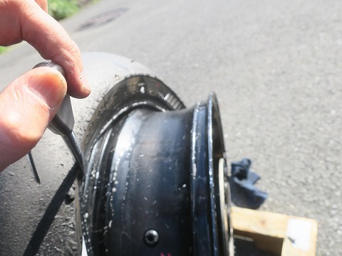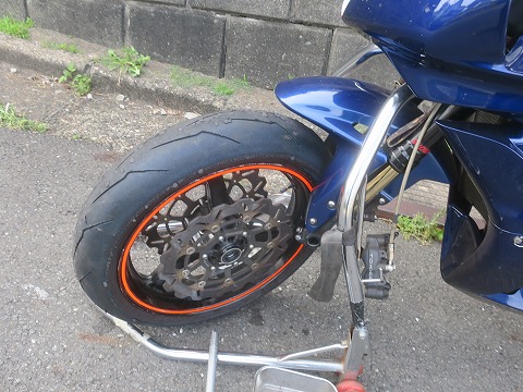 14:33 リヤから まずはリヤタイヤから。 BのV4が付いているホイールをCBRから取り外します。 |