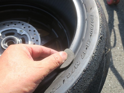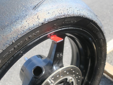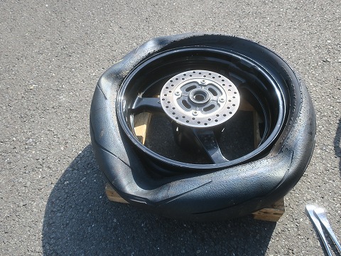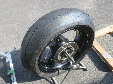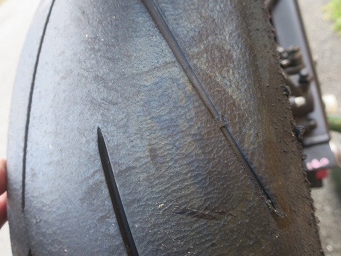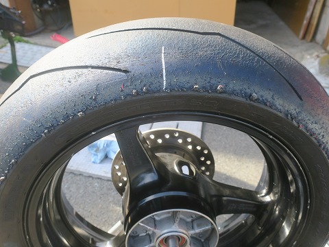14:29 リヤから @のV3の摩耗状態。 写真がダメだった。 スリップマークがあるところが、ちょうど陰になって見えない。 もうちょっとでスリップマークが出ちゃいそうな感じです。 でも、サーキットを走る分には、スリップマークが出てもそれほどグリップダウンしないみたいです。 |