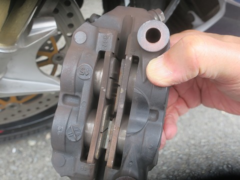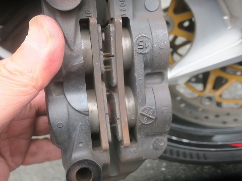 左側は 左側もキャリパーを外して確認。 こっちも同じように 1.5mmくらい残り。 左右、それぞれ4枚のパッドは同じように減っていて、偏摩耗も無いみたいなので、大丈夫でしょう。 キャリパーのピストンかなり汚れてますねぇ。 洗浄したいところですが、ツーリングから帰ってきたらパッドを交換しなきゃならないでしょうから、そのときまで、目を瞑っておきましょう。(笑) |
