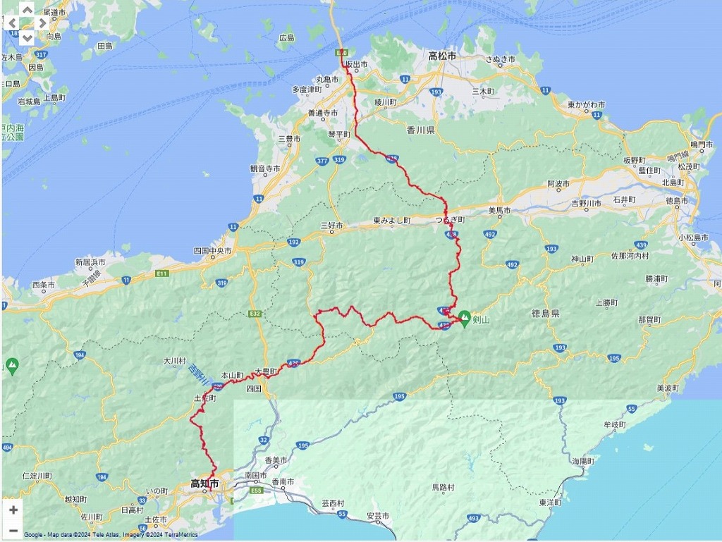 | 午後の道程:坂出市 〜 国道438号 〜剣山 〜 国道439号 〜 大歩危 〜 国道32号 〜 国道439号〜 高知県道16号 〜 高知市 :221.84km | |