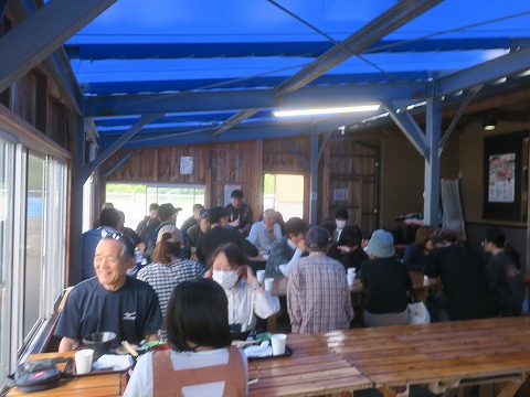 11:54 席に座る 注文は入口にある券売機で食券を購入するスタイル。 食券を購入したら、空いている席を探して陣取ります。 席は、後から増設された感マシマシのプレハブのテーブル席で。 この時期は快適ですが、冬場は寒そうですね。(笑) この時点で7~8割りくらいの人の入りですかね。 料理が提供されるまで少し時間がかかるかもしれませんが、並んで待つこともなく座れたので、ジッと待つことにしましょう。 |