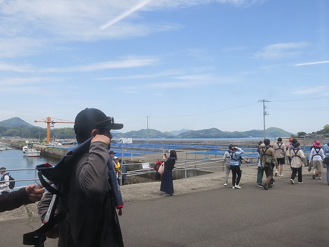 11:56 外では テーブル席の窓際に座って外を眺めると、漁港。 そこにいるのは、どう見ても漁師ではなくて、一般人。 この漁港から、”潮流体験”として、能島城跡めぐりと潮流を体験できる遊覧船が出ていて、それに載る人たちです。 |