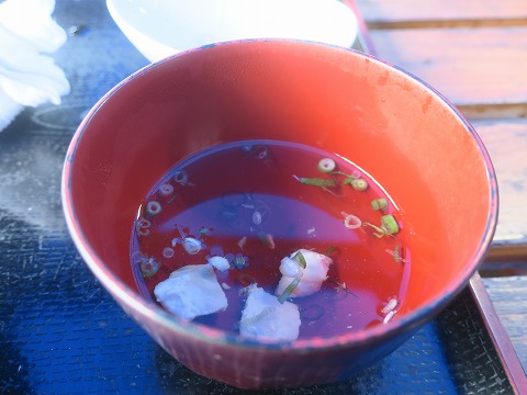 12:18 お椀は お椀は、鯛のアラで出汁を取ったお吸い物。 さっぱりとして味付けで美味しい。 |