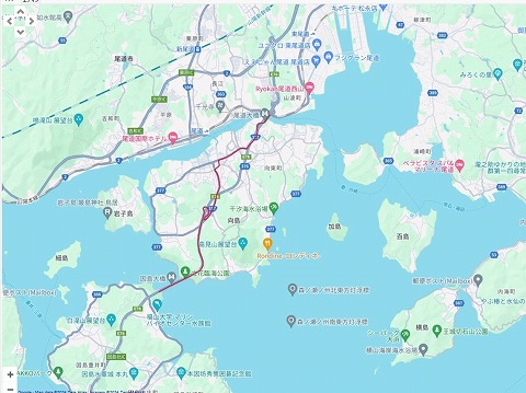 15:53 因島島内を 県道366号線は因島をほぼ1周する県道です。 今回は走る機会がありませんでしたが、因島の東岸は民家も少なく、比較的急峻な土地が広がっているので、路線も面白そうです。 残念ですが、今回は時間切れ。 しまなみ海道にある6つの島を巡ろうと思ったら、午前中から1日かけないと走り切れないですね。 因島北 ICから県道336号線で因島の西岸を少し走り、その後はgoogle mapのルート案内で内陸部に入り、因島南 ICを目指します。 |