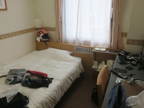 17:17 部屋に チェックインしたら、ホテルの部屋へ。 写真を撮る前に、部屋をとっ散らかしちゃいました。(笑) α1は、エビスサーキットの走行会のときに時々泊まったことがありますが、同じ様な造りですね。 |