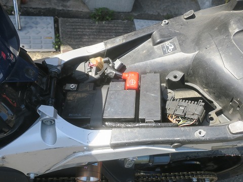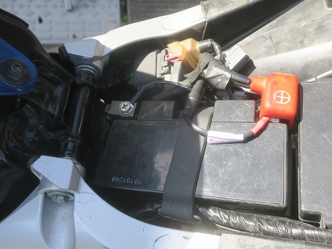 5月12日(日) 9:25 充電を確認 充電して一晩置いて、朝確認しにきました。 コネクタはシートカウルの隙間からアクセスできる位置に取り付けてみました。 |