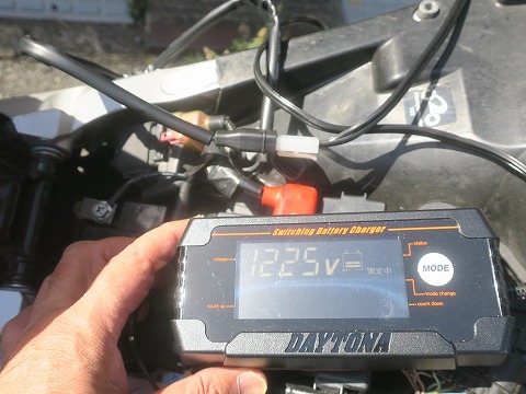14:33 つないでみる さっそく充電器を接続して動作を確認。 12.25Vしかありません。 弱ってますね。 後で、車庫にしまってから、充電することにして。 |