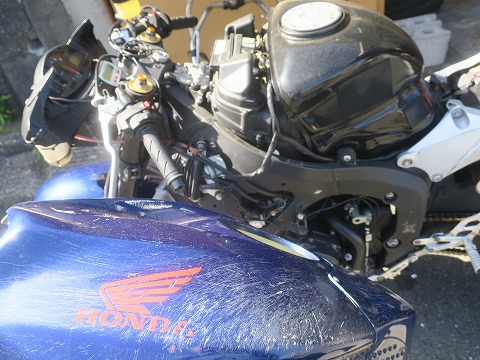 14:46 タンクカバーを CBRのエアークリーナはタンクカバーの中。 まずはタンクカバーを取り外します。 取り外したタンクカバー。 傷だらけですが、自分じゃありませんよ。(笑) 前のオーナの時の転倒傷。 タンクカバーの後ろ側の黒いのがガソリンタンク、その手前がエアークリーナボックス。 |