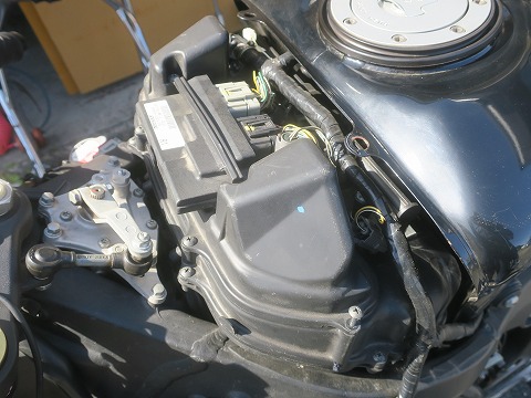 15:10 戻してく エアークリーナを元の位置に戻しました。 黒色のエアークリーナの左端の丸いのがネジが付いているところ、インテークはその真下。 エンジンはダウンドラフトタイプなので、インテークはほぼ上を向いてます。 ネジ、落としそうでしょ。(笑) エアークリーナの点検も終わったので、タンクカバーとかリヤカウルを元に戻して、ガレージに仕舞うことにします。 |