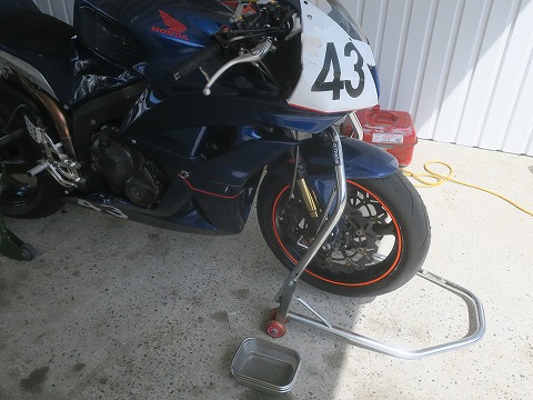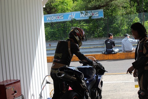 14:28 國川君に 今日もインタナショナルな國川君が乗ります。 最近はST600のバイクでレースに参戦することが無くなりましたが、以前は10年近くST600のバイクでレースしていたので、楽しいみたい。 ガソリンを入れて、エアー圧を調整したら、エンジンを暖気します。 |