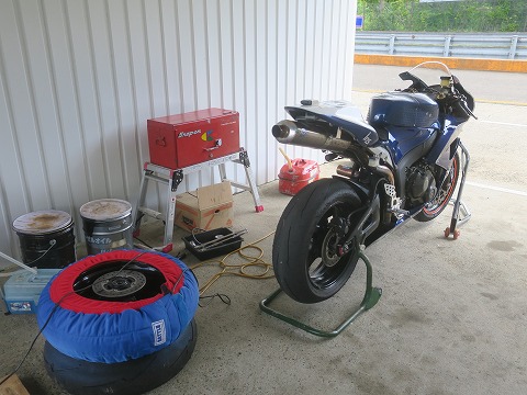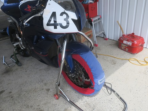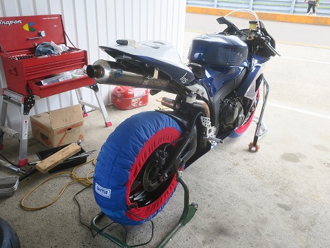 13:44 サーキットに戻って お昼を食べてサーキットに戻ってきました。 ちょっと時間が押してきましたね。 いつもなら、ここでちょっと昼寝を貪る(むさぼる)ところですが、今日はナシですね。 まずはタイヤの入れ替えをしないと・・・・・。 お昼に出る前に、入れ替えるタイヤにウォーマーを巻いて出掛けました。 熱々です。(笑) |