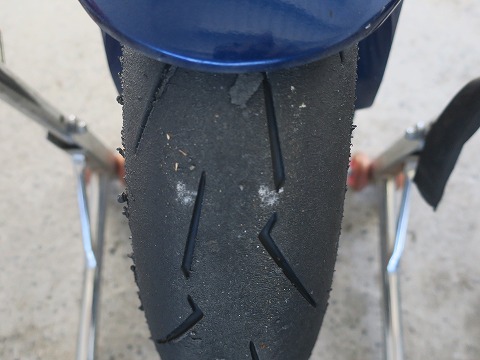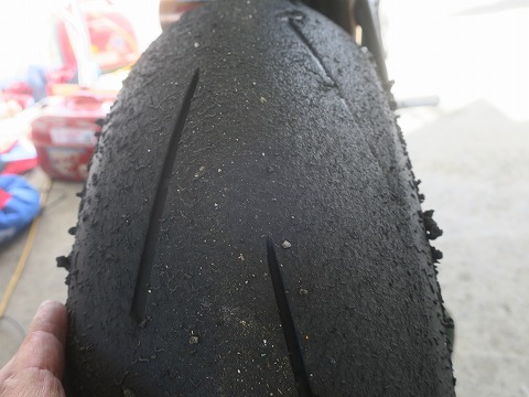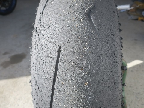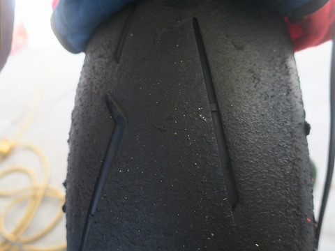 14:16 履き替えたタイヤは このタイヤはDIABLO SUPERCORSA で去年ブランニューになったV4(Version4)。 そこそこ減っていて、スリップマークが見えています。 これも、今日の午後の走行で終わるかな |
