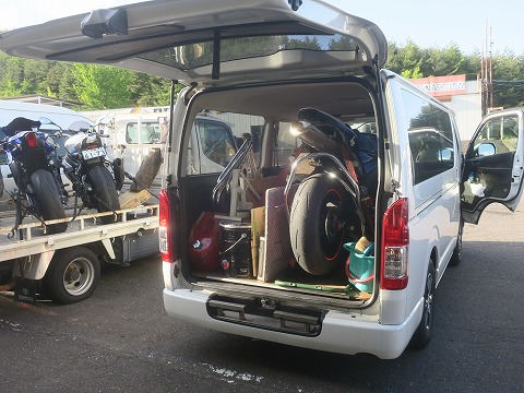16:45 積込み終わり 片付けして、ハイエースにCBRとか道具を積込みました。 今回は、予備のタイヤを積んできたので、結構きつきつ。 時間があれば、使用済みのタイヤはホイールから外しちゃおうかと思っていたけど、時間がなかったね。 それでは撤収することにしましょう。 |