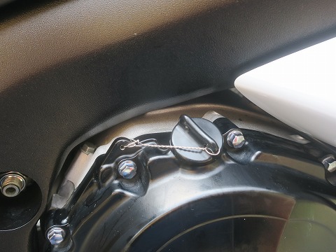 9:44 ワイヤリングを オイルを入れ終わったら、フィラーキャップを締めて。 キャップは締め忘れ、緩み防止のワイヤーロック。 |