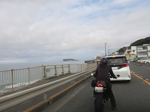 稲村ケ崎を過ぎて左手前方に江の島が見えてきましたが、今日は雲が多くて富士山は見えません。
