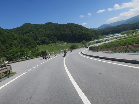 ワインディング区間としてライディングを楽しめるカーブが続きますが、追い越し可の区間も多いのですが、交通量が比較的多く、抜いても抜いてもキリがないので、楽しさ半減です。