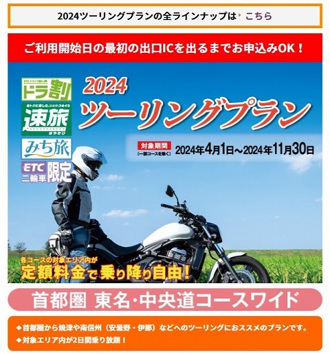 高速を使って遠出するなら、二輪車ETC限定の割引きプラン。